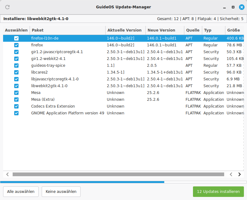 nach dem Drücken des Buttons "nn Updates installieren" sollten die Buttons "Alle auswählen", "Keine auswählen" und "nn Updates installieren" bis zum Ende des Update-Laufes gesperrt sein. Eventuell dann einen neuen Button "Abbrechen" einbauen.